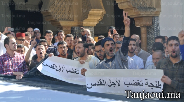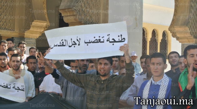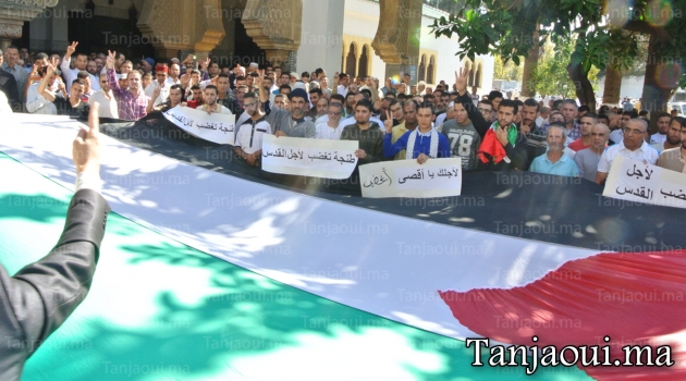 وحمل المشاركون في هذه الوقفة لافتات كتب عليها عبارات من قبيل "من أجلك يا أقصى أغضب"-"طنجة تغضب من أجل القدس"، مرددين شعارات تدين العدوان الإسرائيلي الغاشم على الشعب الفلسطيني الأعزل، وتجرم كل أشكال التطبيع مع الكيان الإسرائيلي، باعتباره خطا أحمر لا يمكن تجاوزه.