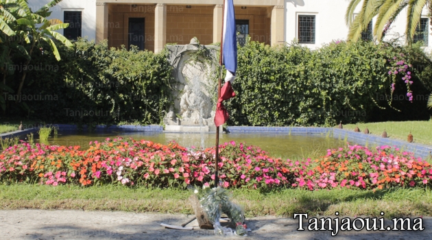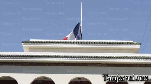 قامت القنصلية العامة الفرنسية بطنجة بتنكيس أعلامها حدادا على ضحايا المجزرة الإرهابية التي هزت العاصمة الفرنسية باريس، ليلة أمس الجمعة، القنصلية وضعت كذلك إكليلا من الزهور ترحما على أرواح الضحايا الذين فاق عددهم 180 قتيل.