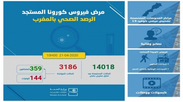 أعلنت وزارة الصحة عن تسجيل 140 حالة إصابة مؤكدة جديدة بفيروس كورونا المستجد بالمغرب، ما بين السادسة من يوم أمس وحتى العاشرة من صباح يومه الثلاثاء، ليرتفع العدد الإجمالي للإصابات المؤكدة بالفيروس إلى 3186 حالة.