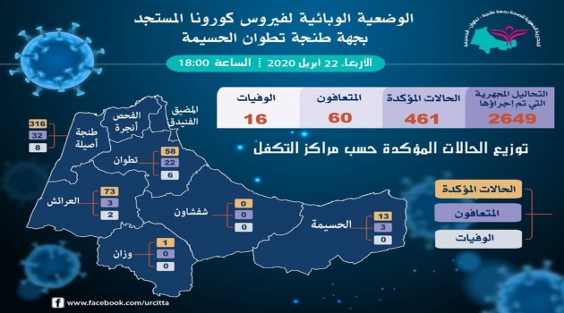 كشفت المديرية الجهوية لوزارة الصحة، لجهة طنجة تطوان الحسيمة أن عدد الحالات المؤكدة بفيروس "كورونا" المستجد على مستوى الجهة بلغ 461 حالة، من أصل 2649 تحليل مخبري تم إجراؤه.