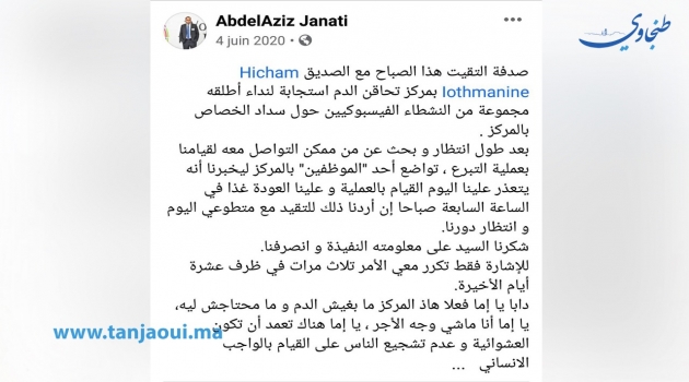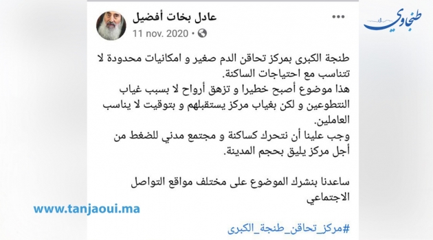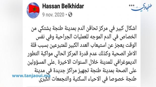 وعن الخصاص المهول في الدم وقلة التجهيزات كتب المستشار الجماعي بطنجة حسن بلخيضر في تدوينة له :