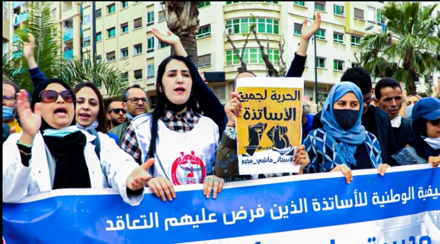 وردد المشاركون في المسيرة شعارات مطالبة بإسقاط ما يصفونه بنظام التعاقد في قطاع التعليم.