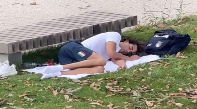 ويبدو أن السباح تمكن من حل مشكلته على طريقته الخاصة – من خلال النوم على الأرض في إحدى الحدائق للحصول على قسط من الراحة بعد التعب.