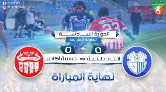 اتحاد طنجة الذي تلقى ضربة قوية عند الدقيقة 15، بخروج المهاجم يحيى بومديان مصابا، لم يتمكن من ترجمة الفرص التي سنحت له الى اهداف، بسبب قلة تركيز وتسرع لاعبيه، وقوة دفاع الخصم السوسي، الذي أغلق الممرات في وجه كل من الجناحين عبدالغني معاوي واحمد حمودان. لتستمر دقائق المباراة سجالا على ما بدأت عليه، الى ان أعلن الحكم عن نهاية اللقاء بتعادل سلبي لم يرض طموحات الفريقين، ليحصدا التعادل الثاني على التوالي.