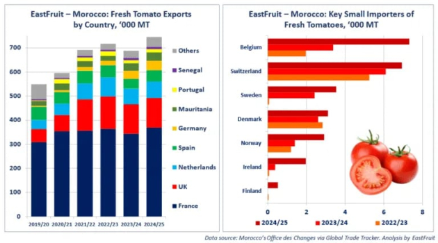 ولا تزال فرنسا أكبر مستورد للطماطم من المغرب، حيث تستحوذ على ما يقرب من نصف إجمالي صادراته في موسم 2024/2025. كما عززت المملكة المتحدة مكانتها كثاني أكبر سوق، حيث اشترت أكثر من 15% من إجمالي الكمية. وتواصل هولندا وإسبانيا، وهما من أكبر مصدري الطماطم، زيادة وارداتهما من المغرب لتمديد مواسم تصديرهما.