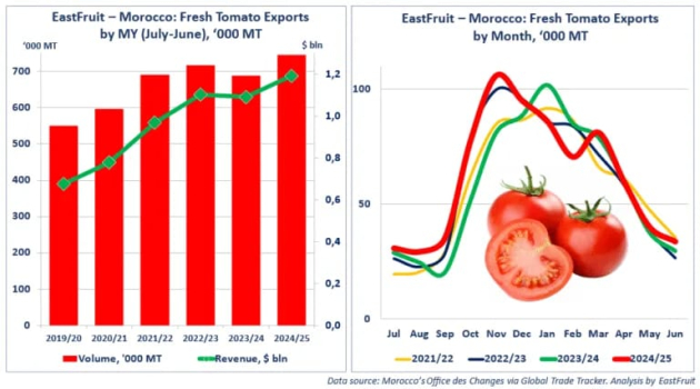 وتُوزّع الصادرات على مدار العام، وقد بلغت ذروتها في نونبر 2024، حين سجّل المغرب رقمًا قياسيًا في تصدير الطماطم بلغ 105 آلاف طن، وهو أعلى حجم تصدير شهري حتى الآن.