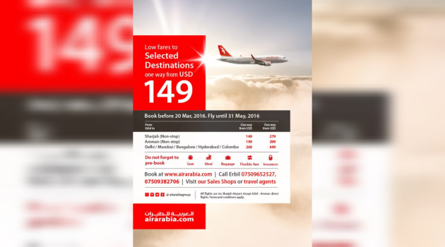 ودعت الشركة كافة الراغبين في الاستفادة من هذا العرض الاستثنائي، المتاح لفترة زمنية محدودة، إلى زيارة الموقع الإلكتروني الرسمي: airarabia.com، حيث يمكنهم الاطلاع على تفاصيل العرض، واختيار الوجهة التي تناسب احتياجاتهم، وإتمام الحجز بكل سهولة ويسر.