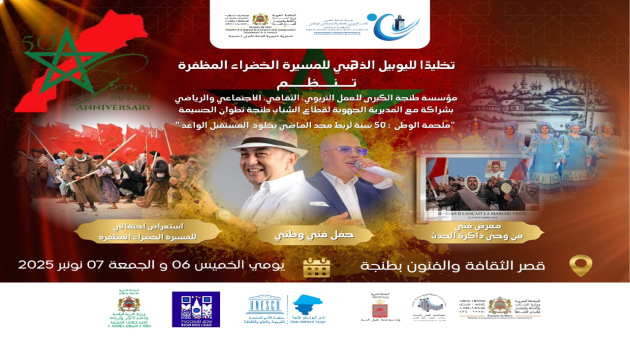 في أجواء من الفخر والاعتزاز، وبمناسبة اليوبيل الذهبي للمسيرة الخضراء المظفرة، تنظم مؤسسة طنجة الكبرى للعمل التربوي، الثقافي، الاجتماعي والرياضي، بشراكة مع المديرية الجهوية لقطاع الشباب طنجة تطوان الحسيمة يومي الخميس والجمعة (6-7 نونبر) احتفالية الوطنية الكبرى تحت شعار.. "ملحمة الوطن : 50 سنة لربط مجد الماضي بخلود المستقبل الواعد".