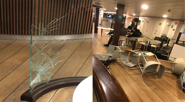 على متن السفينة، كان الوضع مرعباً للركاب أيضاً. فمقاطع الفيديو وثقت مشاهد فوضى عارمة في الفضاء المخصص كمقصف، حيث كانت الكراسي تُقذف في أرجاء الغرفة بفعل التأرجح العنيف للباخرة بسبب ضخامة الامواج وقوة الرياح. ورغم عدم الإبلاغ عن إصابات خطيرة، إلا أن الخوف تملك جميع المسافرين في مواجهة هذه الظروف العنيفة.