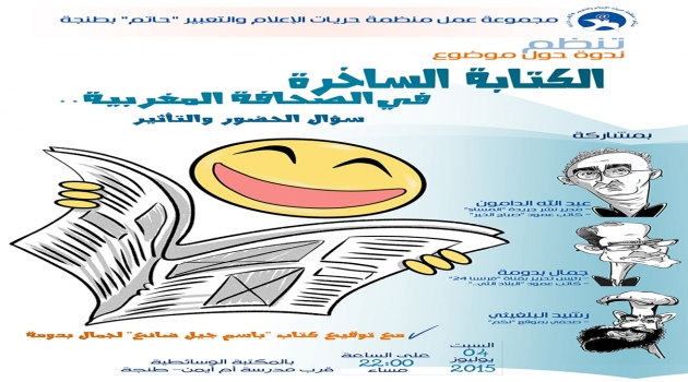 تستعد منظمة حرية الإعلام والتعبير "حاتم"، عبر مجموعة عملها بطنجة، لتنظيم ندوة حول موضوع "الكتابة الساخرة في الصحافة المغربية، سؤال التأثير و الحضور"، وذلك يوم السبت 4 يوليوز الجاري، على الساعة العاشرة ليلا، بالمكتبة الوسائطية قرب مدرسة "أم أيمن"، الكائنة بحديقة عن اقطيوط، بمشاركة صحافيين وإعلاميين وحقوقيين ومهتمين.